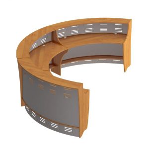 Экраны изогнутых модулей изготовляются из листового металла толщиной 0,8 мм с последующей покраской в светло-серый цвет. В верхней и нижней частях экраны имеют декоративный перфорированный рисунок. Экраны крепятся к радиусным сторонам полок при помощи винтов.